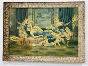 | Nome do Objeto | PINTURA DE ANTONIO COLLINO | | Descrição | OBSERVAÇÃO: A pintura de Antonio Collino retrata uma mulher deitada com sete anjinhos ao seu redor. A obra de arte é um exemplo do estilo barroco, caracterizado pelo uso de cores vivas e dramáticas e pela ênfase no movimento e no detalhe. A figura central, a mulher, é retratada em um estado de paz e tranquilidade, cercada pelos anjinhos que simbolizam a proteção e a inocência. Através de traços suaves e delicados, o artista cria uma atmosfera etérea e celestial, convidando o observador a contemplar a cena com admiração e reverência. A pintura de Antonio Collino é um exemplo excepcional da arte barroca, uma época marcada pelo esplendor e pela grandiosidade, e uma obra que continua a inspirar e cativar o público até hoje. | | Histórico | |
