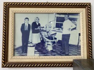 Este é um quadro com a foto do Dr. Vitor Dellagiustina aparentemente com sua família em seu consultório.